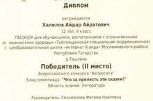 Ученик 6 класс Халилов Айдар принял участие (руководитель – Ф.Н.Гильманова) во Всероссийском конкурсе «Вопросита». В блиц-олимпиаде «Что за прелесть эти сказки!» он получил II место. Поздравляем!