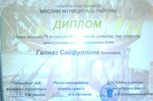Бөек Җиңүнең 70 еллыгына багышланган хикәяләр һәм очерклар конкурсында актив катнашканы өчен Гөлназ Фирдәвес кызы Сәйфуллина диплом белән бүләкләнде.Конкурсны "Татмедиа" АҖ филиалы, район ветераннар советы һәм ДОСААФ оешмасы оештырды.
