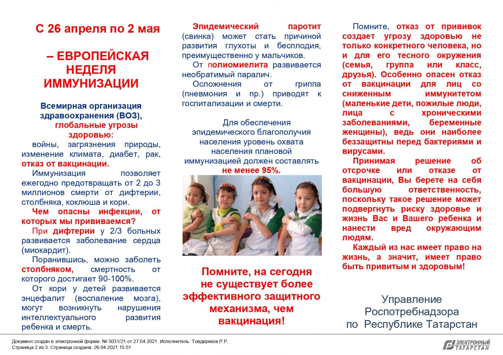 По инициативе Всемирной организации здравоохранения в Европе, в том числе в Российской Федерации и Республике Татарстан в период с 26 апреля по 2 мая 2021 года проводится Европейская неделя иммунизации. Основная цель - повышение уровня знаний населения о важности иммунизации в предупреждении инфекционных заболеваний. -