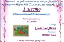 Поздравляем с победами во Всероссийских детско-юношеских конкурсах рисунка и прикладного творчества «Моя Родина-2015» и «Для мамы, для бабушки-2015» воспитанницу объединения «Основы иллюстрации художественного текста» Смолину Анну и её руководителя Серебрякову М.Г.