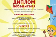 Поздравляем с победой на Международном творческом конкурсе "Вот оно какое наше лето" учащуюся объединения "Мастерилка" Смолину Елизавету и её руководителя Султангарееву Татьяну Петровну.