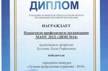 Первичная профсоюзная организация МАОУ ДОД «Детско-юношеский центр №14» (председатель: Хусниева Лилия Рафаилевна) стала Победителем городского конкурса «Лучшая профсоюзная страничка – 2014», который состоялся в декабре 2014 года среди первичных профсоюзных организаций образовательных учреждений.
