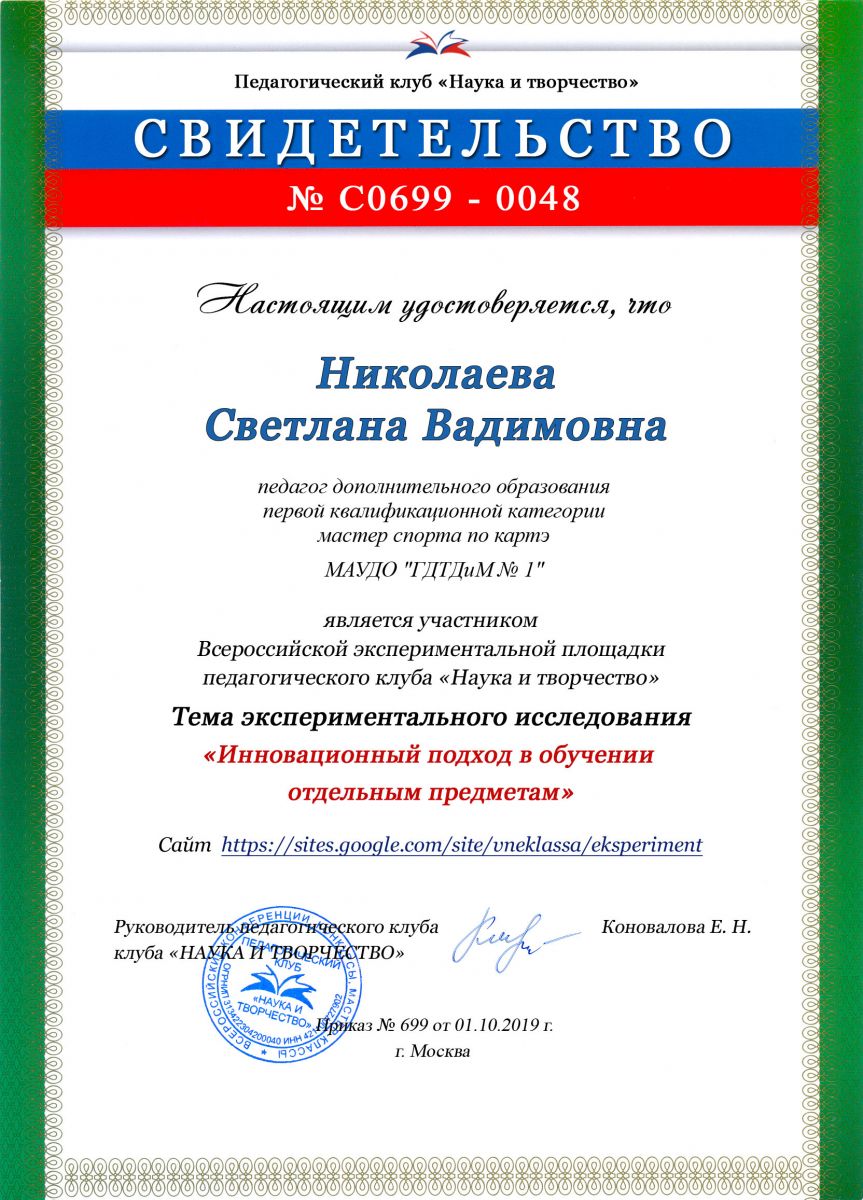 Свидетельство Николаева Светлана Вадимовна.