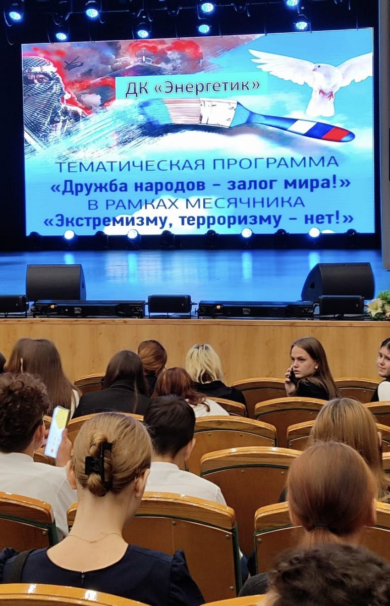 Гимназиянең 8 нче "А"сыйныф укучылары Светлана Старовайтова җитәкчелегендә "Терроризмга һәм экстремизга - юк!" айлыгы кысаларында "Энергетик" мәдәният йорты оештырган "Халыклар дуслыгы- тынычлык нигезе" чарасын тамаша кылып кайттылар. "Артистларның чыгышлары аша укучылар матурлыкка, камиллеккә чик юклыгына һәм тыныч тормыш тудырган рухи кыйммәтләргә ныграк төшенделәр"- , диде сыйныф җитәкчеләре.