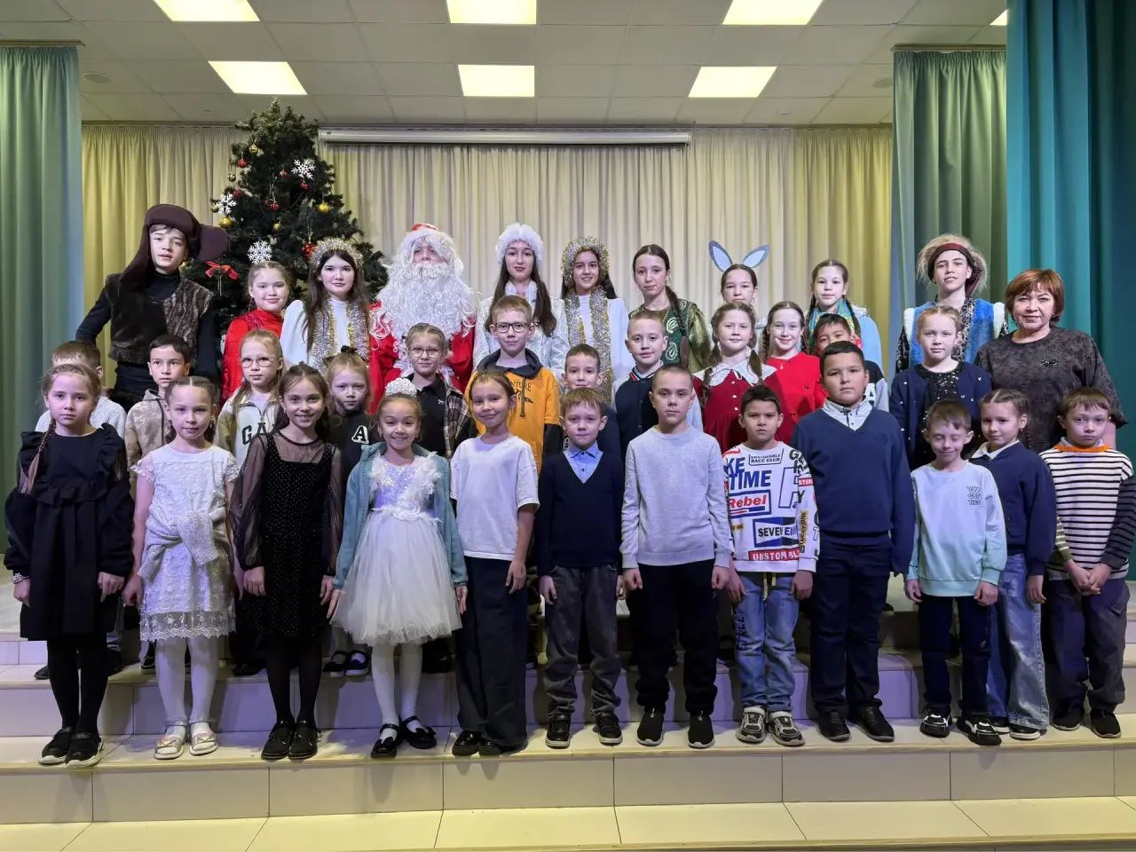 Яшь артистлар шаккаткыч оста уйнадылар! Афәрин! Ул Кыш бабай ролендәге - Дамир Валиевның, Убырлы карчык ролендәге- Руслан Логиновның килештереп уйнауларыннан сокланып туймаслык! Ахатова Лилия, Ахатова Азалина, Сахабиева Мәдинә, Кашапова Зилия,Каримуллина Регина ,Насифуллин Карим Федотова София, Әскарова Ләйлә башкарган рольләр югары дәрәҗәдә кызык итеп ачылган, үзенчәлекле итеп, профессиональләрчә куелган иде. Тылсымчыларның остазлары Татарстанның атказанган артистлары Энҗе Шиһапова белән Чулпан Әскарованың талантлары, тырыш хезмәтләре алдында ихластан баш иябез. Яңа ел тамашасы 5-6 нчы сыйныф укучылары өчен дә куелды, әлеге сыйныф укучылары сәхнәдә ут уйнаттылар: рәхәтләнеп биеделәр, җырладылар. Бездә кашыкчылар, гармунчылар, гитарада уйнаучылар, шәрыкча, заманча биючеләр, кыскасы моңа кадәр ачылмаган талантлар җитәрлек икән! Сыйныф җитәкчеләренең тырышлыгы белән сәхнәгә аяк басарга кыймаган балалар бүген кыюланып киттеләр! Үз күңелеңне үзең күрмәсәң, кем күрсен, дигәндәй, укучылар рәхәтләнеп бәйрәм иттеләр! Афәрин!