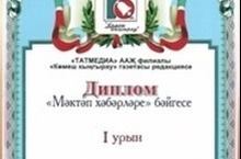 “ТАТМЕДИА” ААҖ филиалы “КӨМЕШ КЫҢГЫРАУ” газетасы редакциясе тарафыннан уздырылган “МӘКТӘП ХӘБӘРЛӘРЕ” бәйгесендә безнең гимназия I урынны алды.