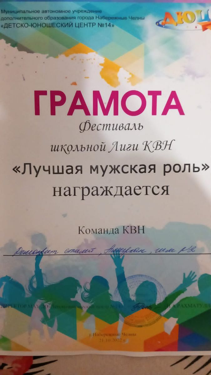 Чаллы шәһәренең 1нче номерлы “Балалар һәм Яшүсмерләр иҗат йортында Шаяннар һәм Тапкырлар клубының мәктәп лигасы” уены булып булып узды. Уенда барлыгы 14 команда катнашты. Мулланур Вахитов исемендәге 2 нче гимназиядән “Замба (Замана балалары) һәм “Демокрит- стелит” ШТК командалары чыгыш ясады һәм “Самая лучшая мужская роль” номинациясендә 9б сыйныфы укучысы Илдарханов Әмирхан (сыйныф җитәкчесе – Федосеева Светлана Григорьевна) җиңеп чыкты. Киләчәк