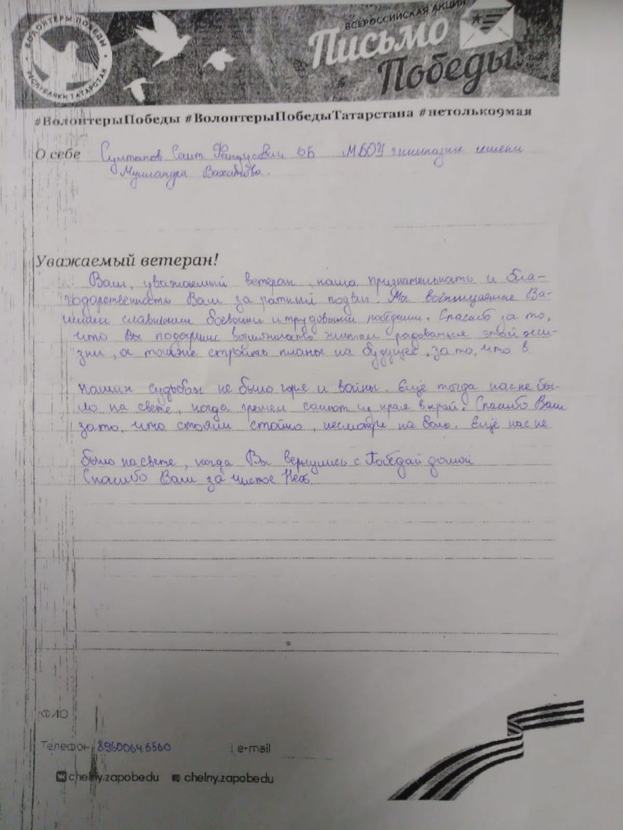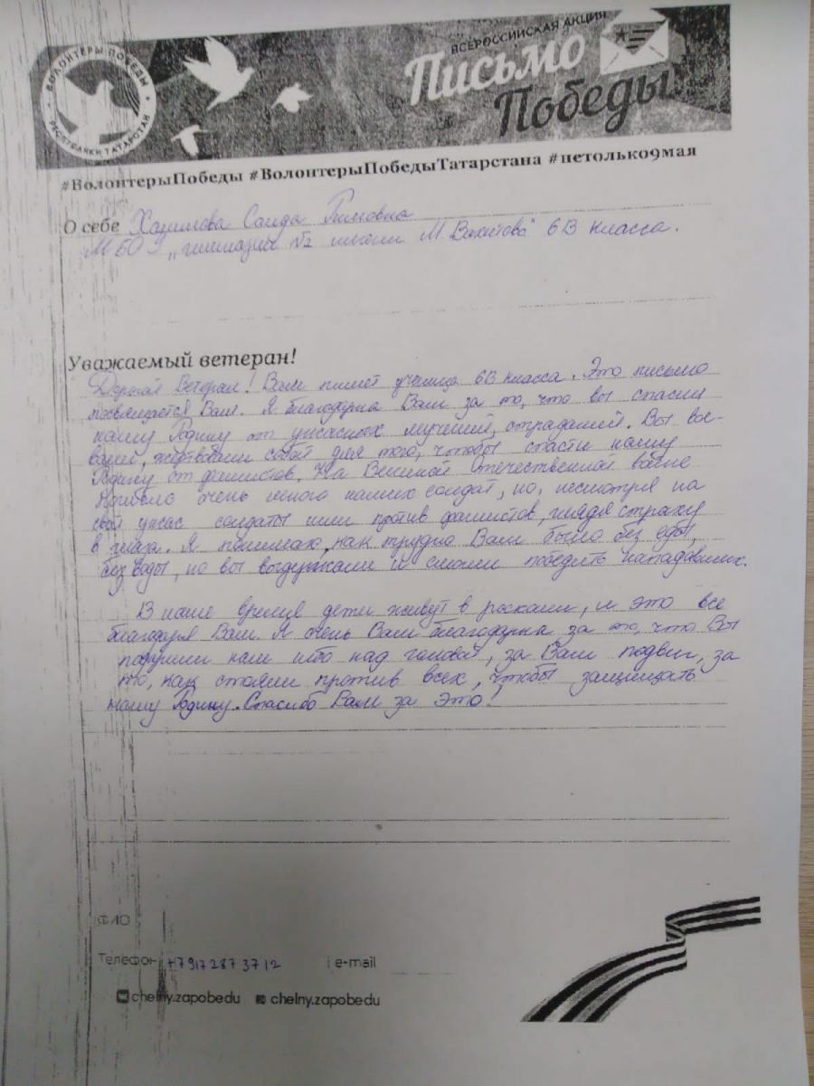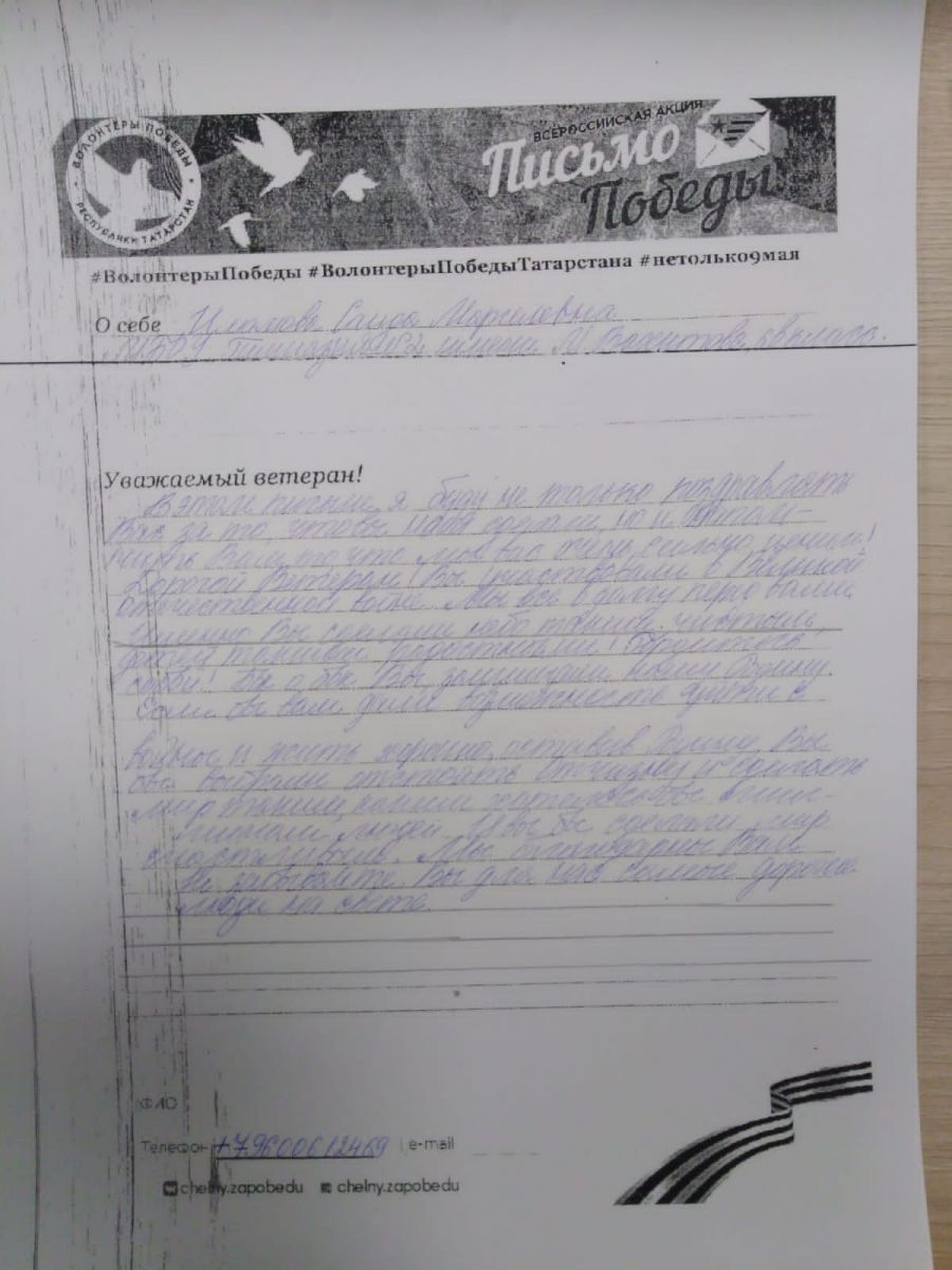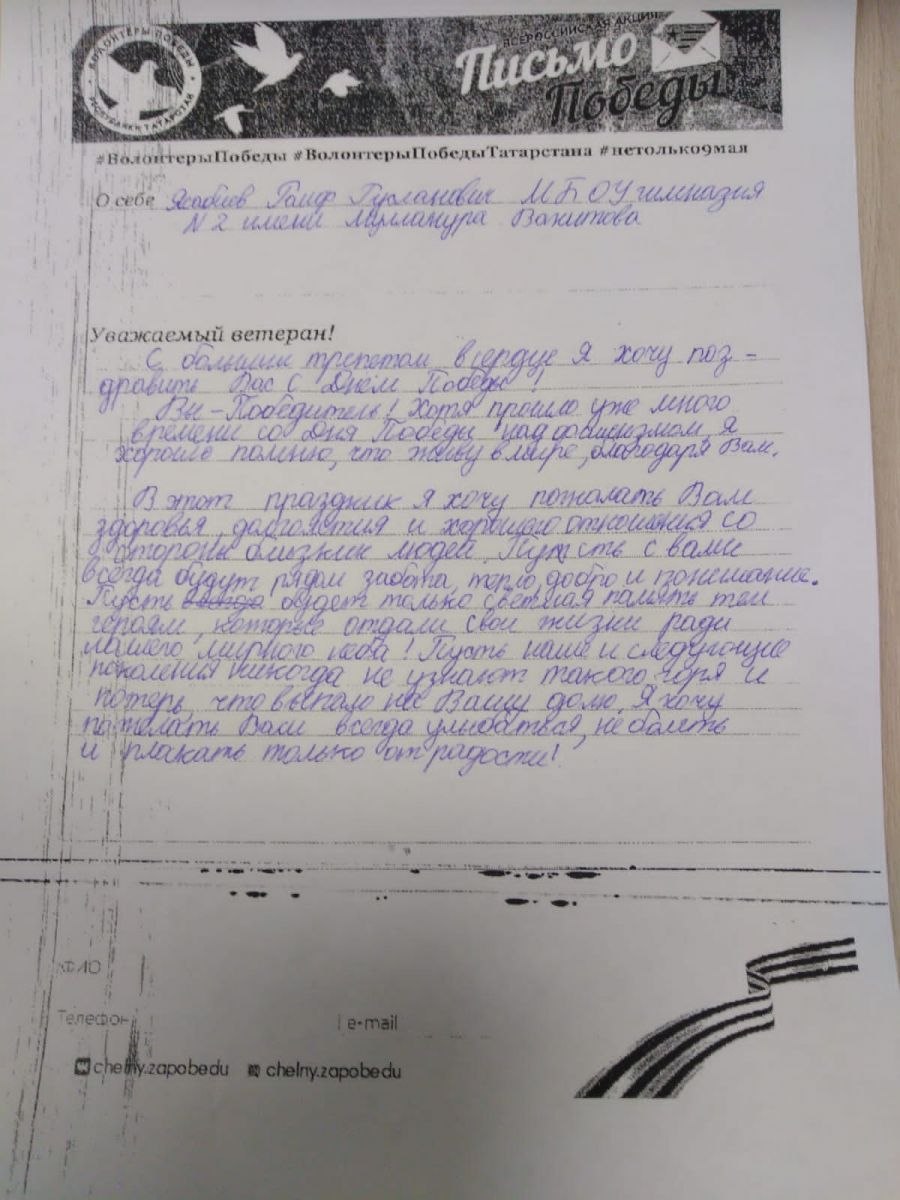 Тиздән 9 Май - Бөек Җиңүнең 77 еллыгы җитә. Шушы уңайдан шәһәребездә төрле акцияләр, чаралар үтә. Һәр елны үткәрелә торган “Җиңү хаты” – “Письмо Победы» дигән акциядә безнең гимназия укучылары бик теләп катнаша. Укучылар Бөек Җиңүгә үз өлешләрен керткән ветераннарга хөрмәт йөзеннән җылы эчтәлекле хат юллыйлар. Патриотик рухта язылган әлеге хатларда Ватанны саклап башларын салган яшь гомерләргә дан җырлана. Киләчәк буын, әби - бабаларыбызның фидакарь батырлыкларын истә тотып геройлар үрнәгендә тәрбияләнсә, безнең илебезгә бернинди куркыныч янамас!