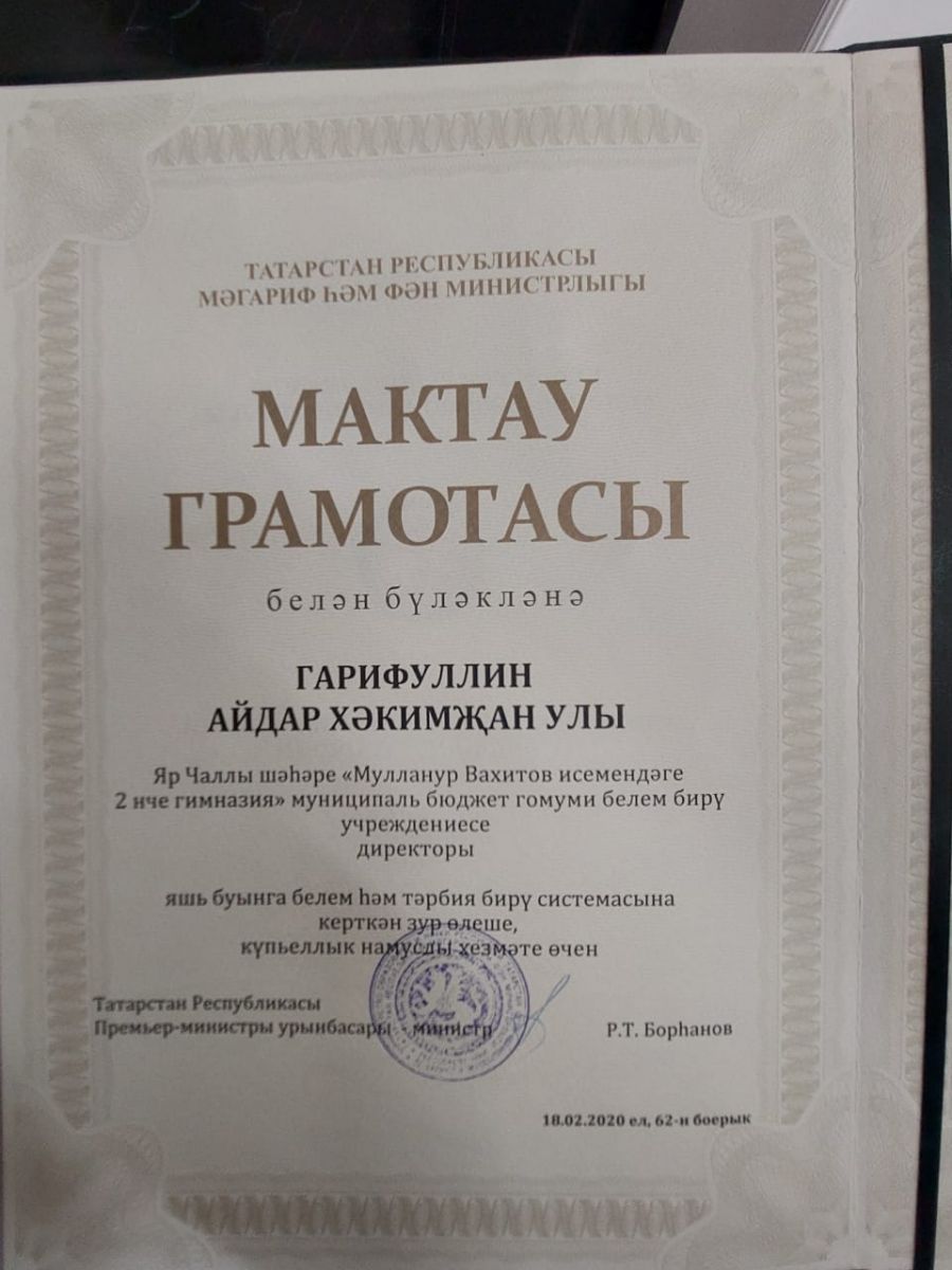 Яшь буынга белем һәм тәрбия бирү системасына керткән зур өлеше, күпьеллык намуслы хезмәте өчен гимназиябезнең директоры Гарифуллин Айдар Хәкимҗан улы Татарстан Республикасы Мәгариф һәм фән министрлыгының Мактау грамотасы белән бүләкләнде.