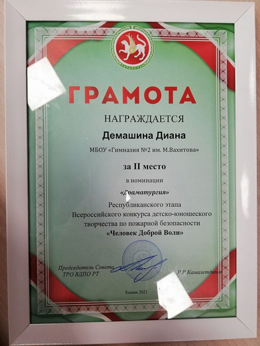 Уку елын башлануга, укучыларның уңышларын бәяләп, мактау грамоталары килә башлады. Янгын куркынычсызлыгы буенча “Человек – доброй воли” (“Яхшы холыклы кеше”) Бөтенрәсәй әдәби конкурсының Республикакүләм этабында 10б сыйныфы укучысы Демашина Диана “Драматургия” номинацияседә 2 урын яулады. Диананы котлау өчен Яр Чаллы шәһәре ВДПО башлыгы Власова Любовь Александровна килде. Дианага истәлекле бүләкләр тапшырды, киләчәктә дә гимназия укучыларын янгынга каршы уздырыла торган бәйгеләрдә катнашырга чакырды.