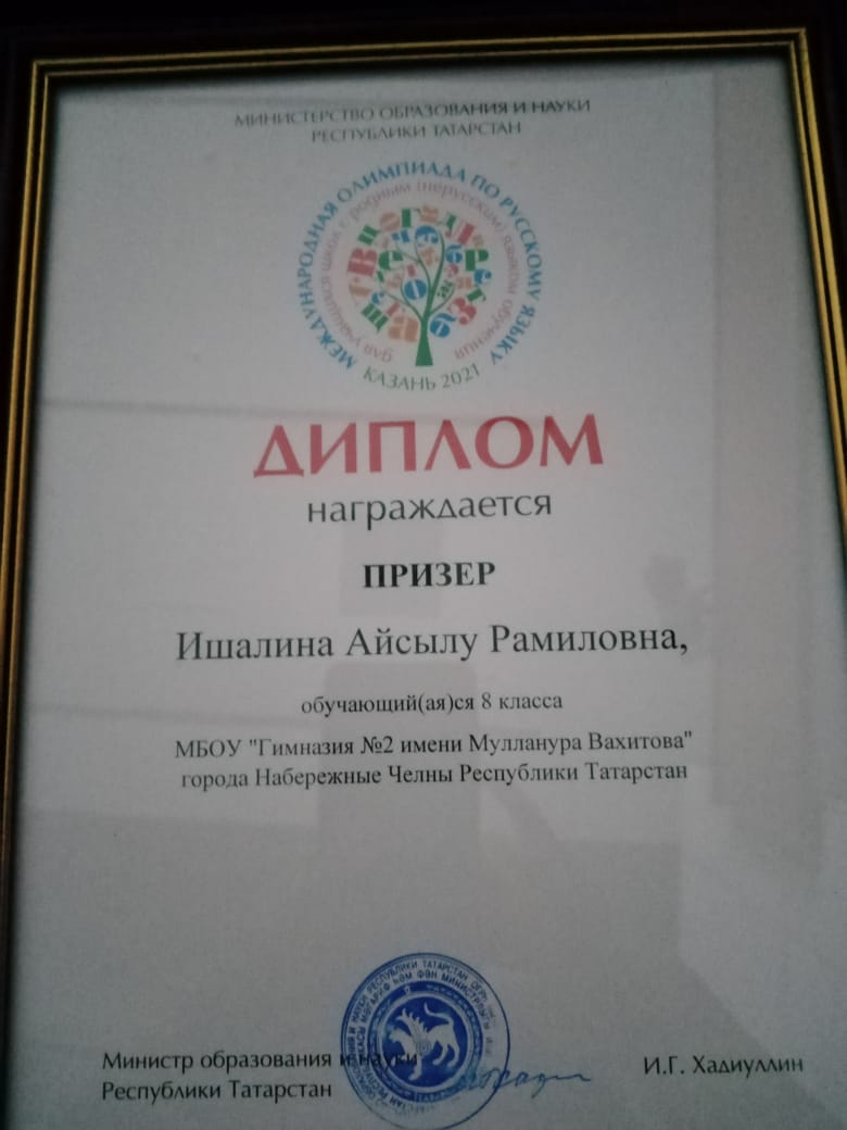 Поздравляем ПРИЗЕРА Международной олимпиады по русскому языку для учащихся школ с родным (нерусским) языком обучения - ученицу 8 класса Ишалину Айсылу и учителя русского языка и литературы Зарипову Альбину Ахматовну. Молодцы!