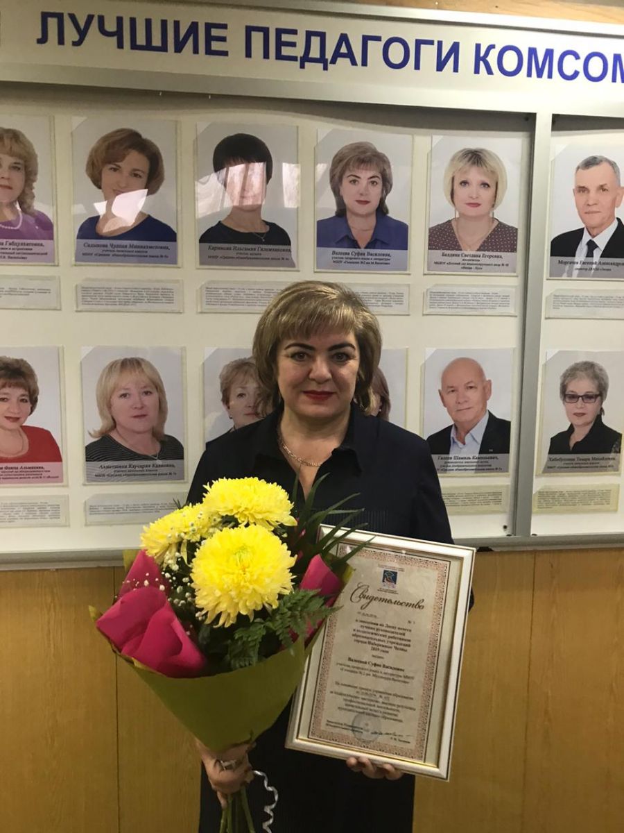 За достижение высокого профессионального мастерства, личный вклад в решение актуальных задач образования и воспитания 20 педагогов занесены на Доску почета «Лучшие педагоги Комсомольского района». Среди них и наш учитель татарского языка и литературы Валеева Суфия Василовна. Поздравляем!