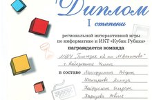 Поздравляем дипломантов региональной интерактивной игры по информатике и ИКТ «Кубик Рубик» в составе: Мосифуллина Роберта (9б), Шангареева Алмаза (9б), Хайруллина Ильдара (9б), Хафизова Равиля (9б) – диплом I степени.Объявляется благодарность учителю информатики Хазиевой Альбине Мударисовне за подготовку учеников. Желаем здоровья и дальнейших успехов!