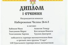 Диплом I степени за победу в третьей лиге у команды в следующем составе: Бабиков Иван, Зиятдинов Марат, Тазетдинова Зарина, Ахметов Тимур, Котлячков Никита, Трунов Дмитрий.