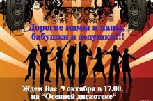Дорогие мамы, папы, бабушки и дедушки! Приглашаем Вас 9 октября в 17.00 на "Осеннюю дискотеку".