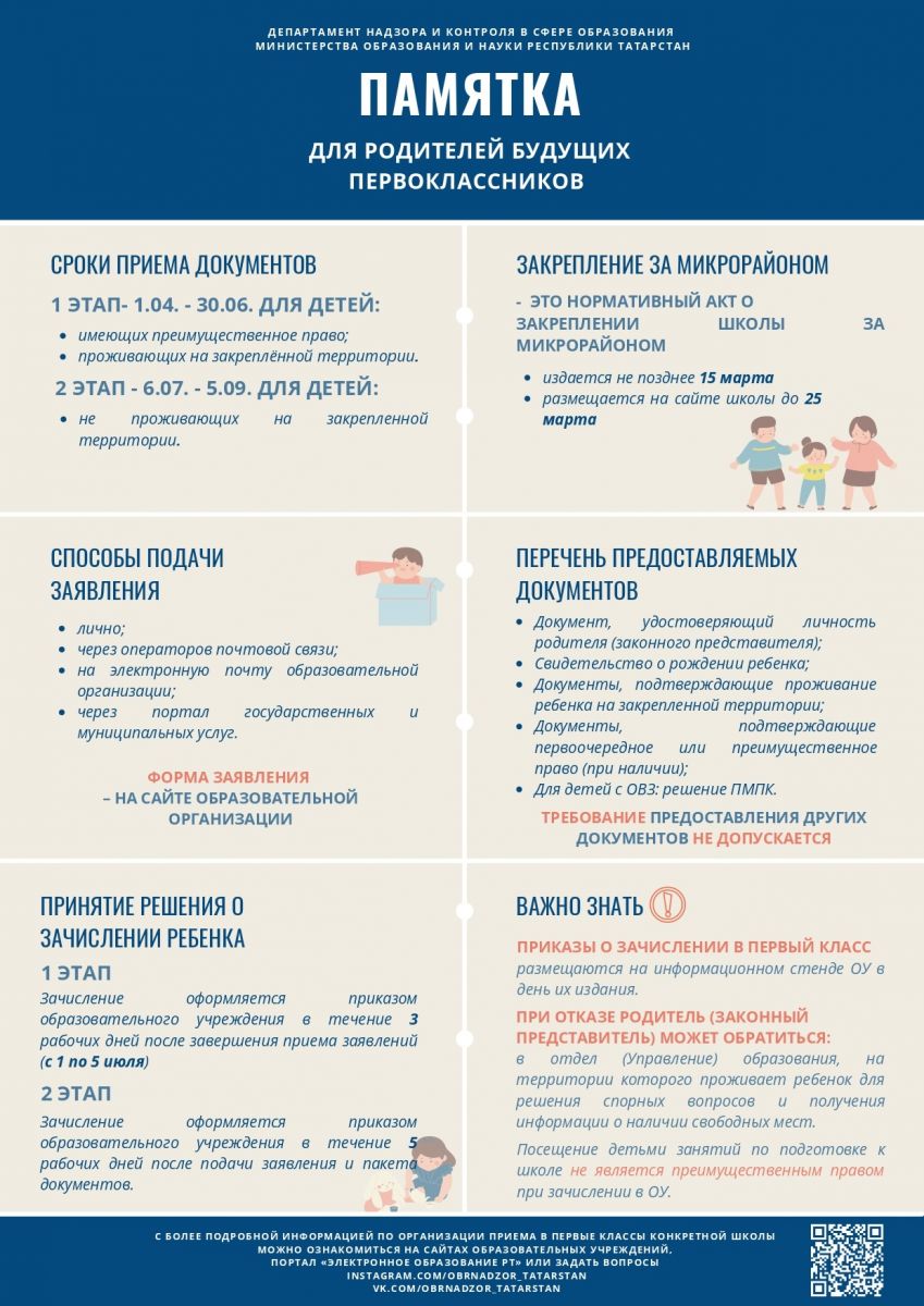 С 01 апреля 2026 года объявляется прием заявлений в 1 класс на 2026-2027 учебный год. Согласно приказа Минпросвещения РФ от 02.09.2020 №458 «Об утверждении Порядка приема на обучение по образовательным программам начального общего, основного общего и среднего общего образования» установлены следующие сроки подачи заявлений в первый класс: