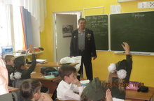 Тимуровцы пригласили на смотр строя и песни воина-интернационалиста Мустафина Васила Вагизовича. Он принимал парад учеников начальной школы. Затем в классе ребята пообщались с ним поближе. Интересно было посмотреть награды и фотографии.