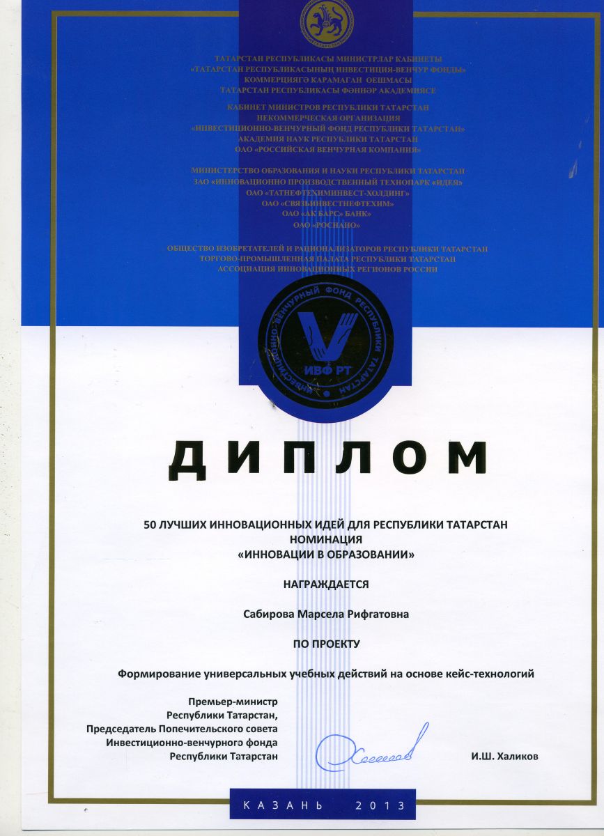 2013 год. 50 лучших идей для Республики Татарстан. Номинация "Инновации в образовании". Проект "Формирование универсальных учебных действий на основе кейс-технологий.
