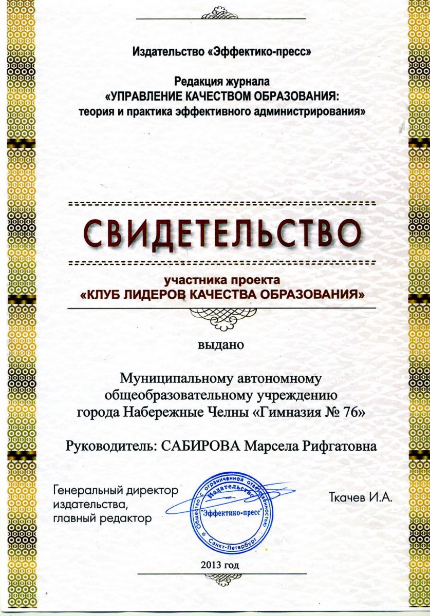 2013 год. Участник проекта "Клуб лидеров качества образования"