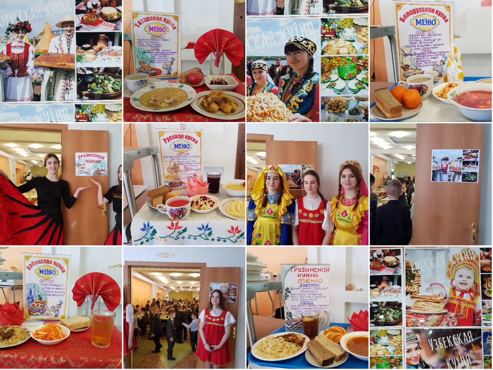 В школьной столовой были представлены блюда грузинской, русской, белорусской, татарской, узбекской кухни. Во время перемен учащиеся 8Б класса, одетые в национальные костюмы, встречали у дверей столовой, зазывая всех за столы. В течение недели во время перемен были организованы видеофильмы, которые знакомили ребят с культурой, традициями и кухней разных народов. Эта неделя оставила яркий след в памяти ребят. Они с удовольствием пробовали: чахохбили, азу по-татарски, плов по-узбекски. Фото