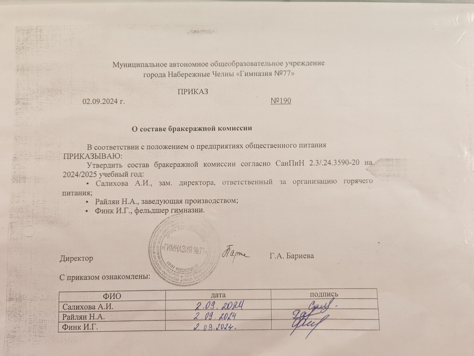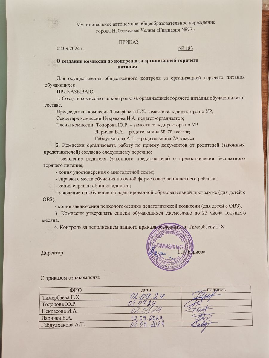 - Приказ о создании комиссии по контролю за организацией горячего питания
