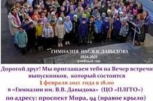 Мы приглашаем тебя на Вечер встречи выпускников. который состоится 1 февраля 2025 г в 18-00 в Гимназии им. В.В.Давыдова по адресу :