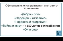 Советом по вопросам проведения итогового сочинения в выпускных классах утверждены пять открытых направлений тем сочинения на 2019-2020 учебный год: «Война и мир» – к 150-летию великой книги, «Надежда и отчаяние», «Добро и зло», «Гордость и смирение», «Он и она». Комплекты тем итогового сочинения для различных регионов станут известны за 15 минут до его начала по местному времени. Успешное написание итогового сочинения является для выпускников 11 классов допуском к государственной итоговой аттестации. Оценивается оно по системе «зачет»/«незачет». Обучающиеся с ограниченными возможностями здоровья вместо итогового сочинения вправе выбрать написание изложения. Итоговое сочинение, в случае представления его при приеме на обучение в вузы, действительно в течение четырех лет, следующих за годом написания. Выпускники прошлых лет, в том числе ранее писавшие итоговое сочинение, могут написать его по желанию. При этом в вузы они смогут представить итоговое сочинение только текущего года, а сочинение прошлого года аннулируется. Основной срок написания итогового сочинения в текущем учебном году - 4 декабря 2019 года. Обучающиеся, получившие неудовлетворительный результат «незачет», не явившиеся на итоговое сочинение (изложение) или не завершившие его написание по уважительным причинам смогут написать сочинение в дополнительные сроки –5 февраля и 6 мая 2020 года.