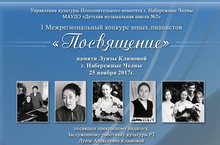 Уважаемые гости и жители города! Приглашаем Вас на I Межрегиональный конкурс юных пианистов «Посвящение» памяти Л.Климовой. Конкурсные прослушивания состоятся в Набережночелнинском колледже искусств 25 ноября 10.00 - Торжественное открытие конкурса 10.15 - номинация «Фортепиано» (соло) 12.00 - Перерыв 13.00 - номинация «Фортепиано» (соло) 14.00 - номинация «Фортепианные ансамбли» 16.00 - Церемония награждения 21.11.2017