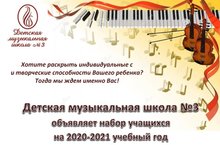 Детская музыкальная школа № 3 объявляетнабор учащихсяна новый 2020-2021 учебный год.тел. учебной части - (8552) 54-79-62Прием документов: с 25 апреля по 31 мая.Консультации: 1,2 июня в 18.00Приемные испытания: 3 июня в 17.00В связи со сложившейся обстановкой, сроки могут меняться.Следите за информацией. -