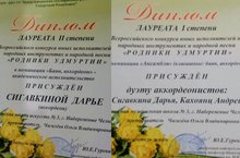 Поздравляем наших учащихся, юных аккордеонистов - участников Всероссийского конкурса юных исполнителей на народных инструментах и народной песни "Родники Удмуртии" (г.Ижевск): Сигавкина Дарья- лауреат II ст., Дуэт: Кахоянц Андрей, Сигавкина Дарья - лауреат I ст. (преп. Чигилёва О.В.)