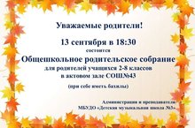 13 сентября в 18.30 в актовом зале СОШ №43 состоится родительское собрание для родителей учащихся 2-8 классов.