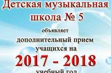 Детская музыкальная школа №5 объявляет дополнительный прием учащихся на 2017-2018 уч.г. Вступительный экзамен состоится 25 августа в 10:00.