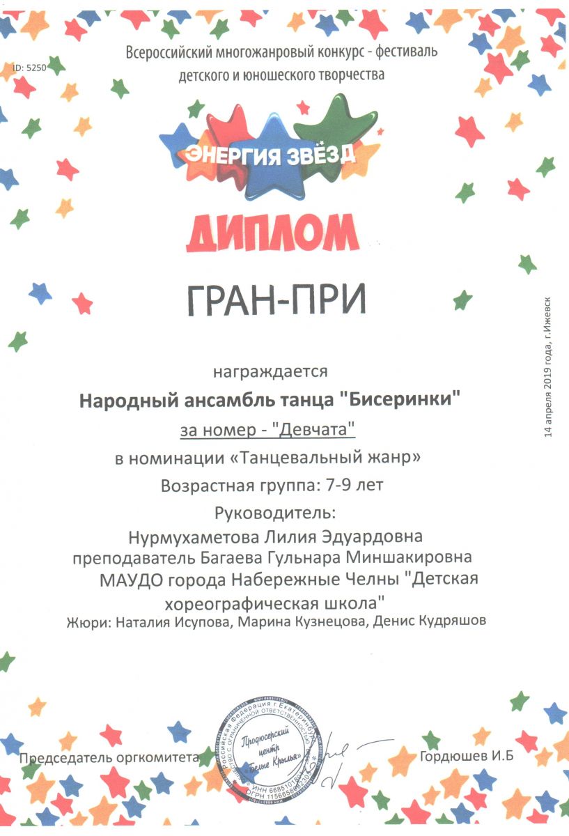 14 апреля 2019 года состоялось поездка в город Ижевск на Всероссийский многожанровый конкурс-фестиваль детского и юношеского творчества «Энергия звезд», в котором приняли участие учащиеся 2 класса, преподаватель Багаева Г.М. Жюри конкурса высоко оценила выступление нашего ансамбля и мы получили ГРАН ПРИ.