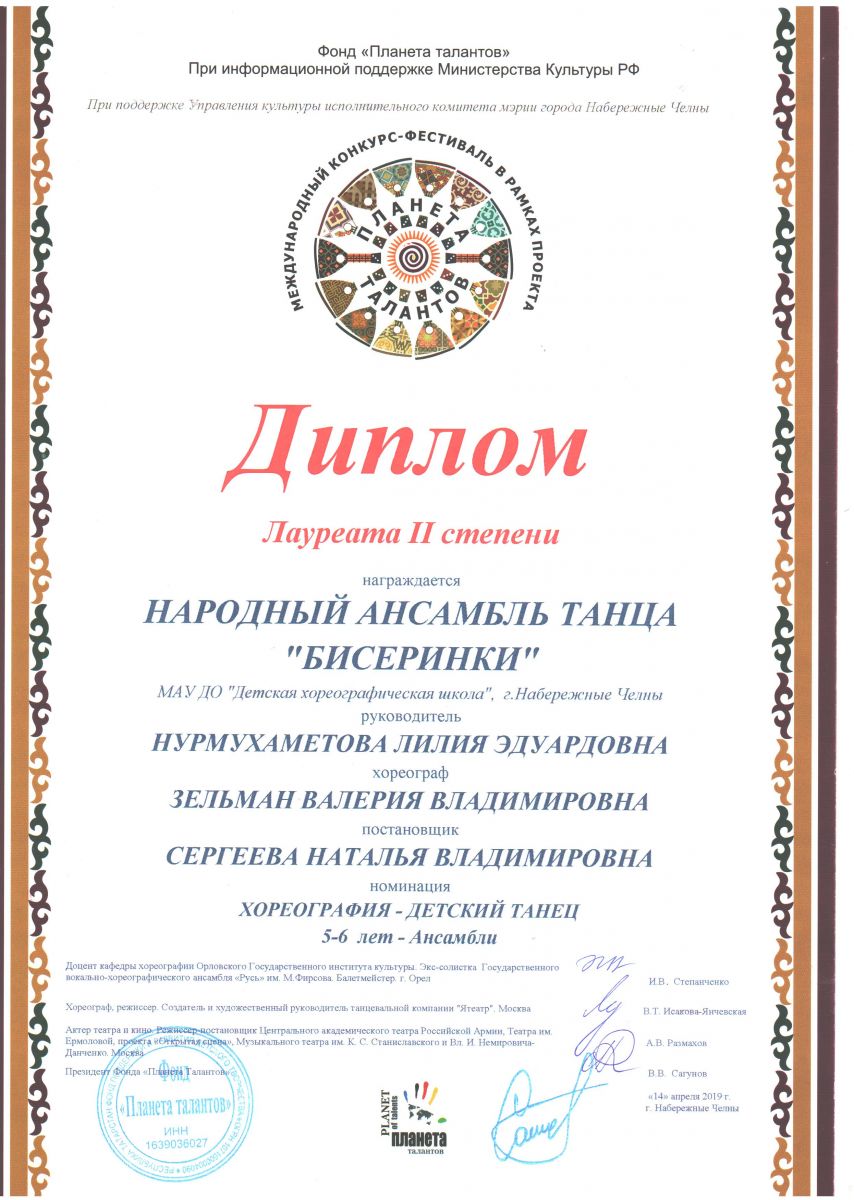 13 апреля 2019 года прошёл Международный конкурс-фестиваль в рамках проекта «Планета Талантов». В нём приняли участие младших и средних классов ансамбля Бисеринки. Итогом стала высшая награда ГРАН ПРИ, два диплома Лауреата I степени и диплом Лауреата II степени: классы преподавателей Русиновой А.Р., Гилязовой Н.Е., Зельман В.В. и Багаевой Г.М.
