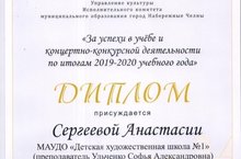 Диплом за успехи в учебе и концертно - конкурсной деятельности по итогам 2019 - 2020 учебного года 01.04.2021