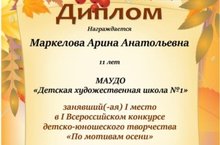 Поздравляем обучающуюся Детской художественной школы №1 Маркелову Арину (преподаватель Яшина Елена Александровна) с победой в I Всероссийском конкурсе детского-юношеского творчества «По мотивам осени».