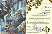 Беляева Алиса (преподаватель Алевтина Сергеевна Данилова) приняла участие в V Республиканском конкурсе юного художника «Обычаи, обряды: забытые и близкие» среди учащихся детских школ искусств Республики Татарстан, посвященном 80-летию Победы в Великой Отечественной войне 1941-1945 г.г. и году защитника Отечества в Российской Федерации.