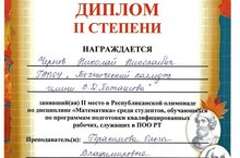 Поздравляем студента 1 курса группы ЧПУ-9-14 Чернова Николая с призовым местом в Республиканской олимпиаде по дисциплине "Математика".