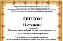 Поздравляем преподавателя Технического колледжа Садыкову Гульшат Дамировну с достойной победой - 2 место в Республиканском методическом конкурсе «Мастерство педагога среднего профессионального образования» в номинации «Методическая разработка внеклассного мероприятия естественнонаучного направления».