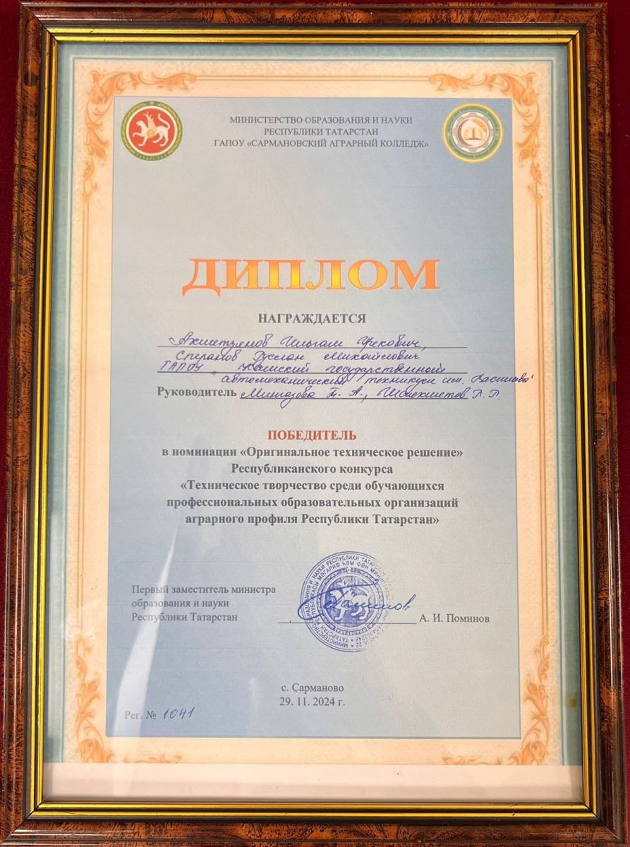 Опубликовано: 03.12.2024Проект «Современные плуги в сельском хозяйстве» был представлен на республиканском конкурсе «Техническое творчество среди обучающихся профессиональных образовательных организаций аграрного профиля» по направлению «Техническое творчество и сельскохозяйственной техника,оборудование» в Сармановском аграрном колледже.