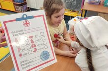 Сегодня наша подготовительная группа продолжает свое знаомство с миром прфессий. Воспитанники старшей группы посетили наш медицинский блок, где их встретил гость – настоящая медсестра. Она рассказала о своей работе, показала рабочие инструменты и научила детей правильно ухаживать за своими зубами. В конце дети играли в сюжетную игру «Поликлиника», где лечили кукол.