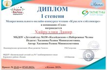 Шушы көннәрдә Казан шәһәрендә “Күңелем сәйләннәре” дип аталган Төбәкара шигырь укучылар бәйгесе узды. Бәйгенең төп шарты – шигырьнең педагог тарафыннан иҗат ителгән булуы. Бу чарада безнең балалар бакчасыннан Хәйруллин Данир катнашты. Ул балаларны ана теленә өйрәтүче тәрбияче апасы Рәзинә Хәсәнованың “Ак барс” хоккейчысы булам” дигән шигырен сөйләде һәм бәйгенең I дәрәҗә лауреаты исеменә лаек булды. Рәзинә Миңлеәхмәтовнаны һәм тырыш малаебыз Данирны ихлас котлыйбыз, яңадан-яңа үрләр яулауларын телибез!