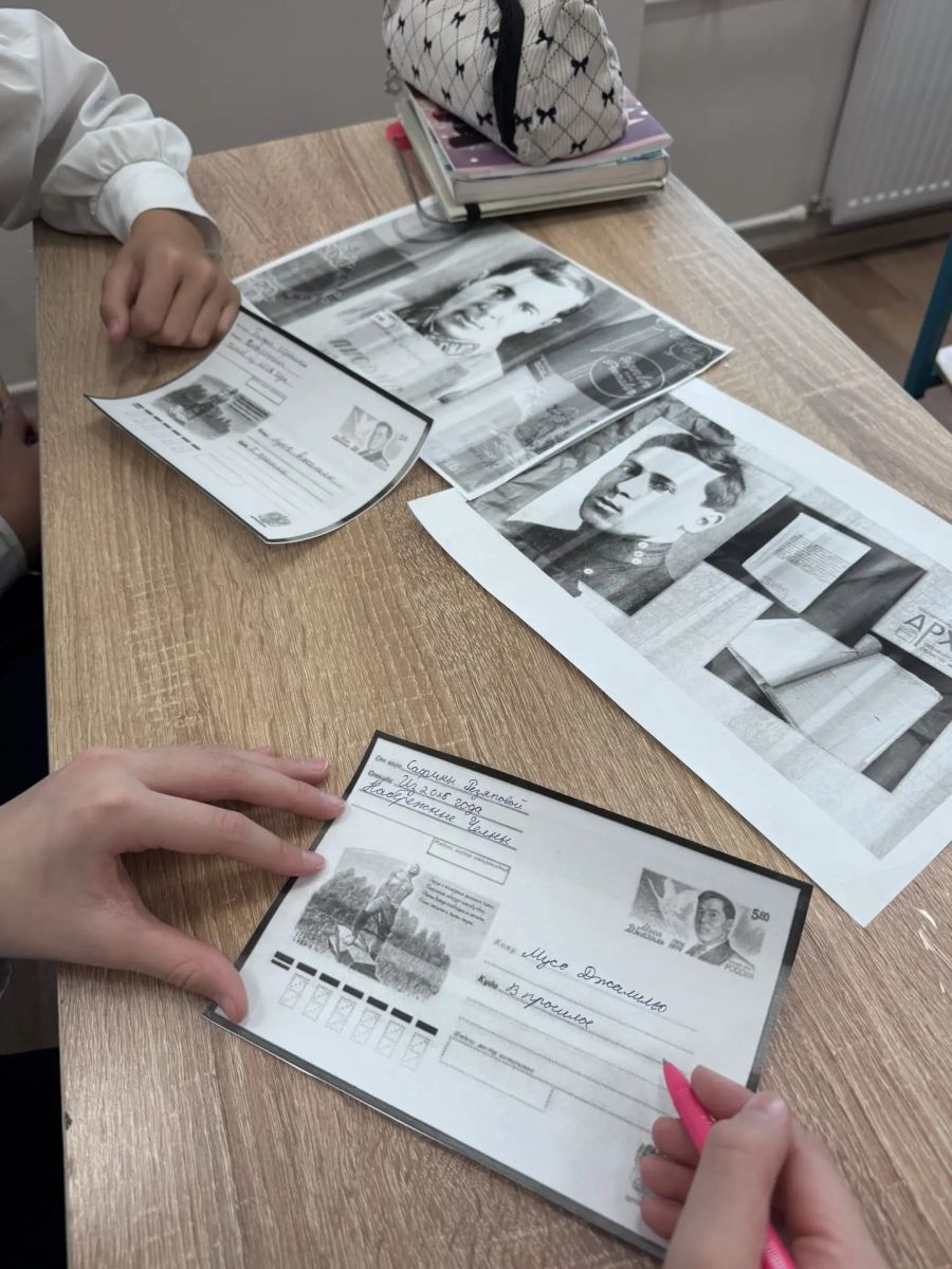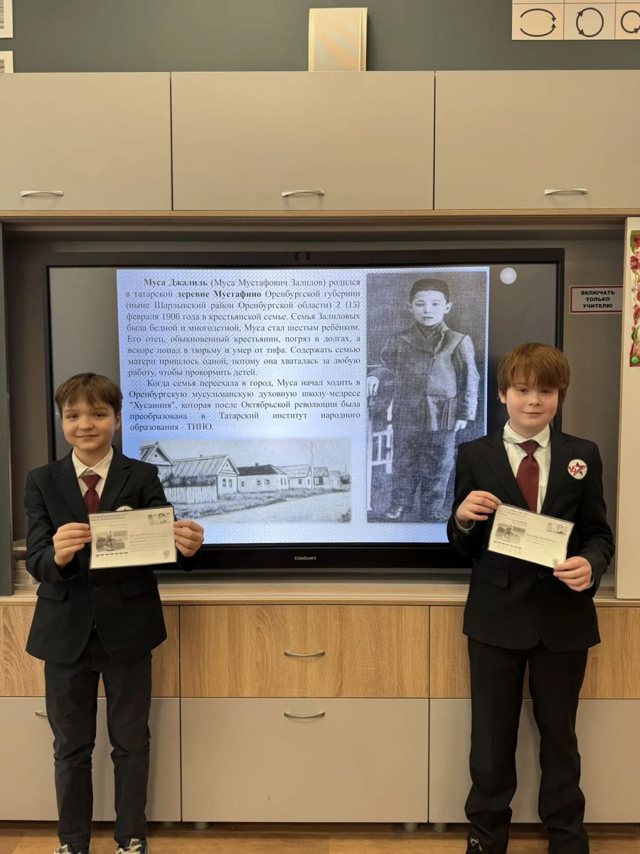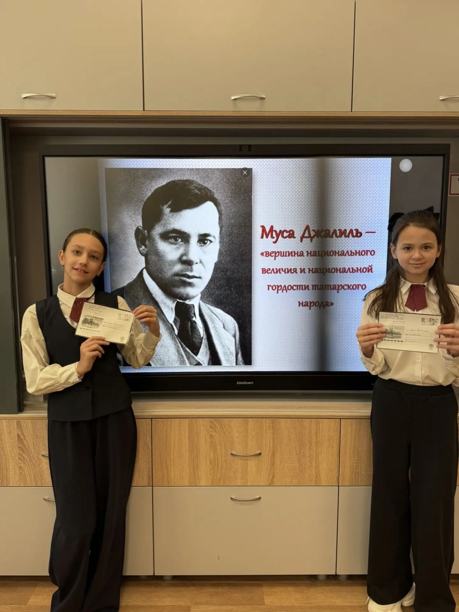 Ученики 6 Б и 5 Г класса на занятии, посвященном Дню рождения Мусы Джалиля. Ученики изучили биографию поэта, узнали интересные факты из его жизни и творчества и написали Герою Советского союза письмо в прошлое, поблагодарили его за подвиг во имя Родины и за творчество.