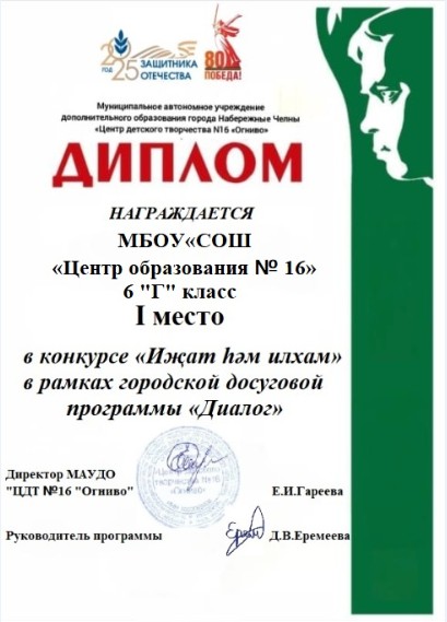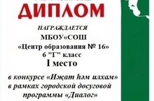 Шәһәребезнең «16 нчы «Чакматаш» балалар иҗат үзәге» оештырган «Диалог» шәһәркүләм программасының «Иҗат һәм илхам» конкурсында 1 урын алган 6Г сыйныфы командасын чын күңелдән котлыйбыз. Укучыларга һәм җитәкчеләре Бахтиева Э.З.га рәхмәтебезне белдерәбез.