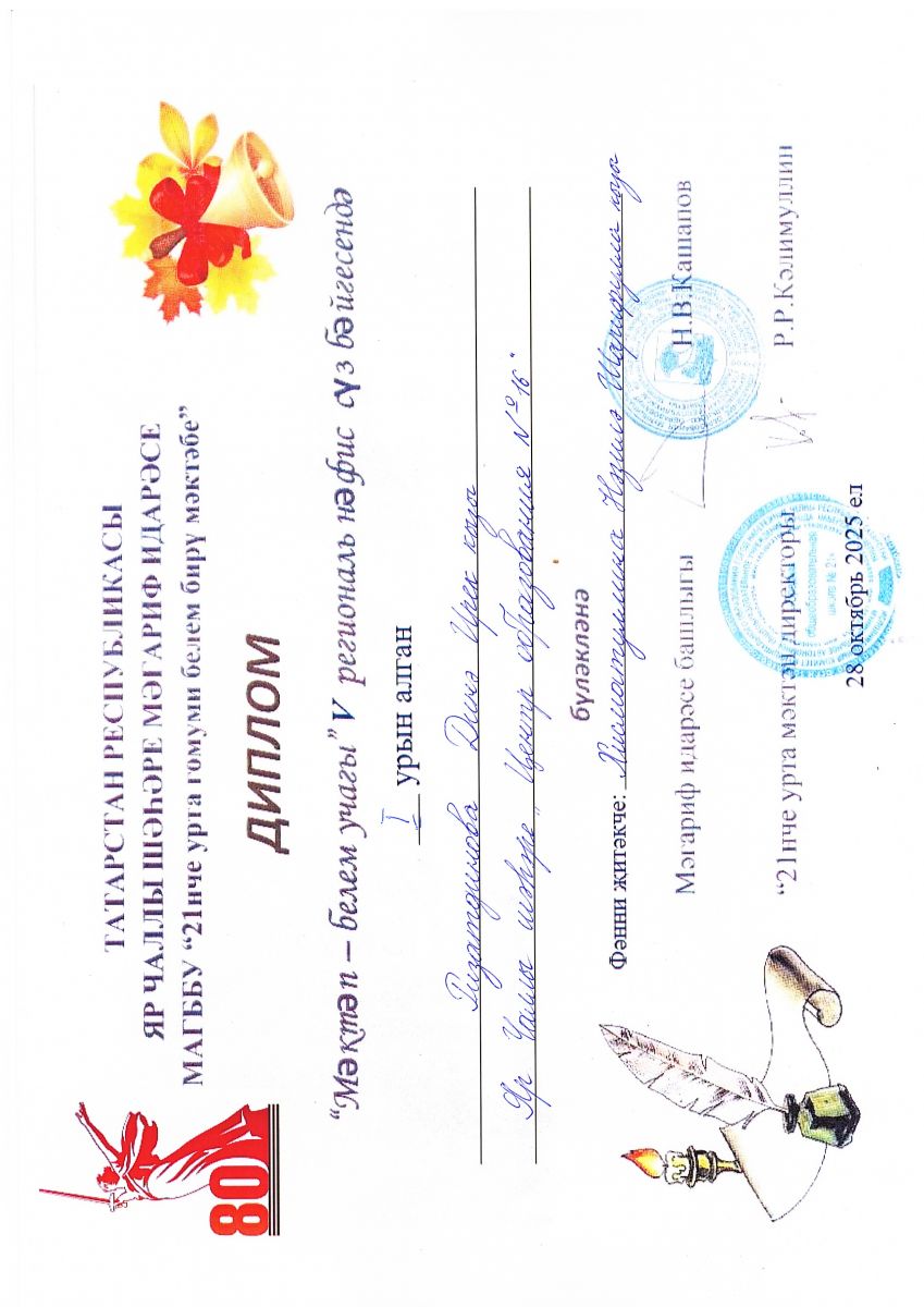 21 нче мәктәп базасында «Мәктәп — белем учагы» конкурсы узды. 2А сыйныфы укучысы Ризатдинова Динә 1 урынга лаек булды. Укытучысы Хисматуллина Н.Ш. һәм Динәгә рәхмәт белдерәбез.