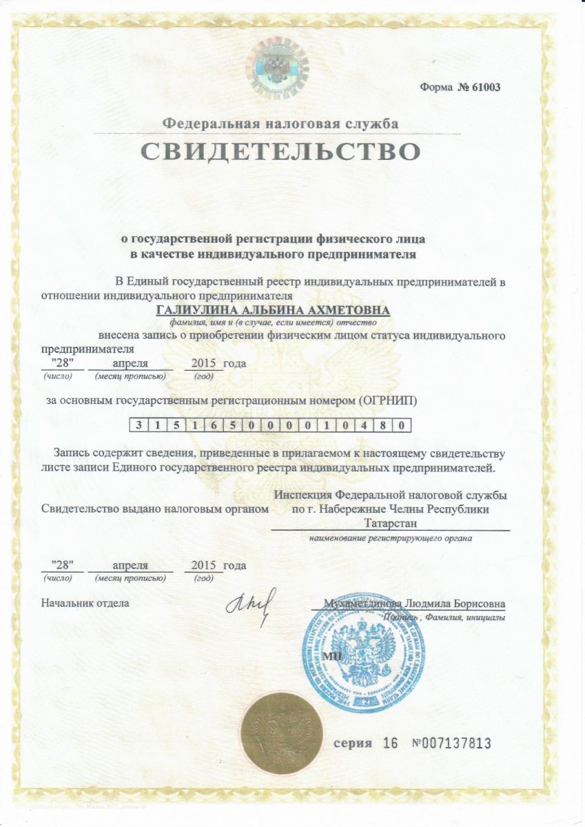 Полное официальное наименование образовательной организации на русском языке: Индивидуальный предприниматель Галиулина Альбина Ахметовна