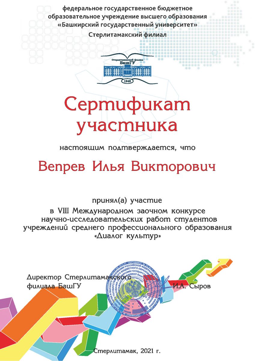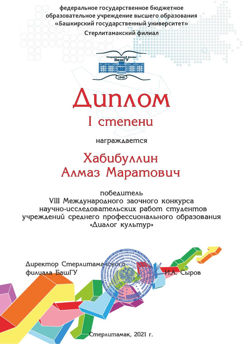 Опубликовано: 04.06.2021На базе колледжа Стерлитамакского филиала ФГБОУ ВО «Башкирский государственный университет» прошел VIII Международный заочный конкурс научно-исследовательских работ студентов учреждений среднего профессионального образования «Диалог культур». В конкурсе приняли участие студенты нашего колледжа.