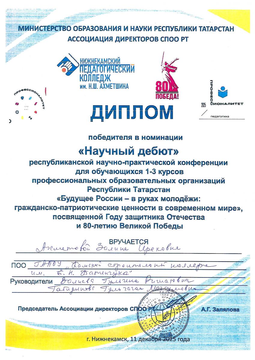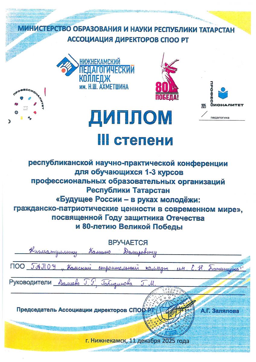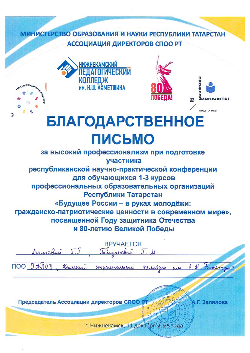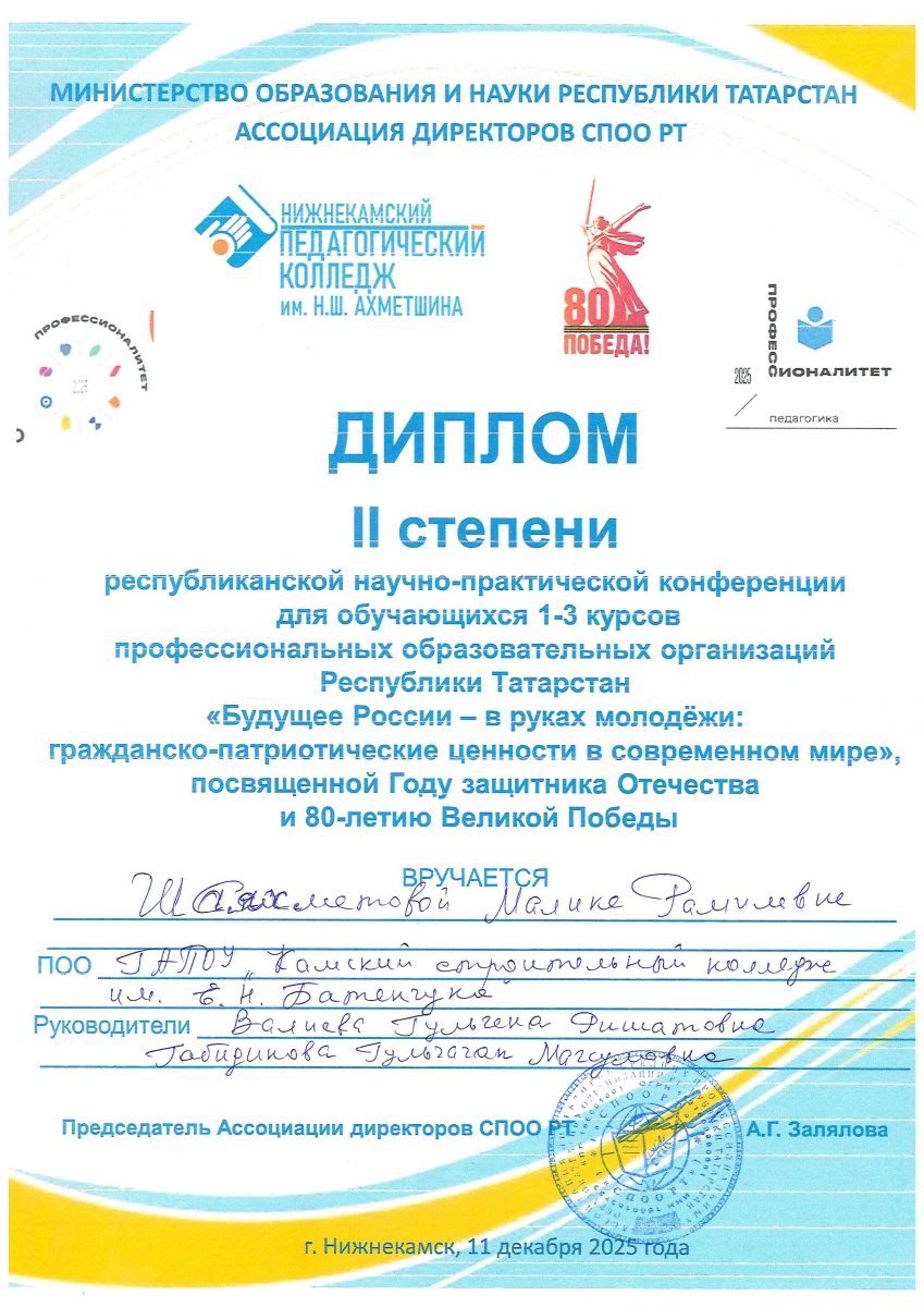 Республиканская научно-практическая конференция для обучающихся 1-3 курсов профессиональных образовательных организаций Республики Татарстан «Будущее России – в руках молодежи: гражданско-патриотические ценности в современном мире», посвященная Году защитника отечества и 80-летию Великой Победы.