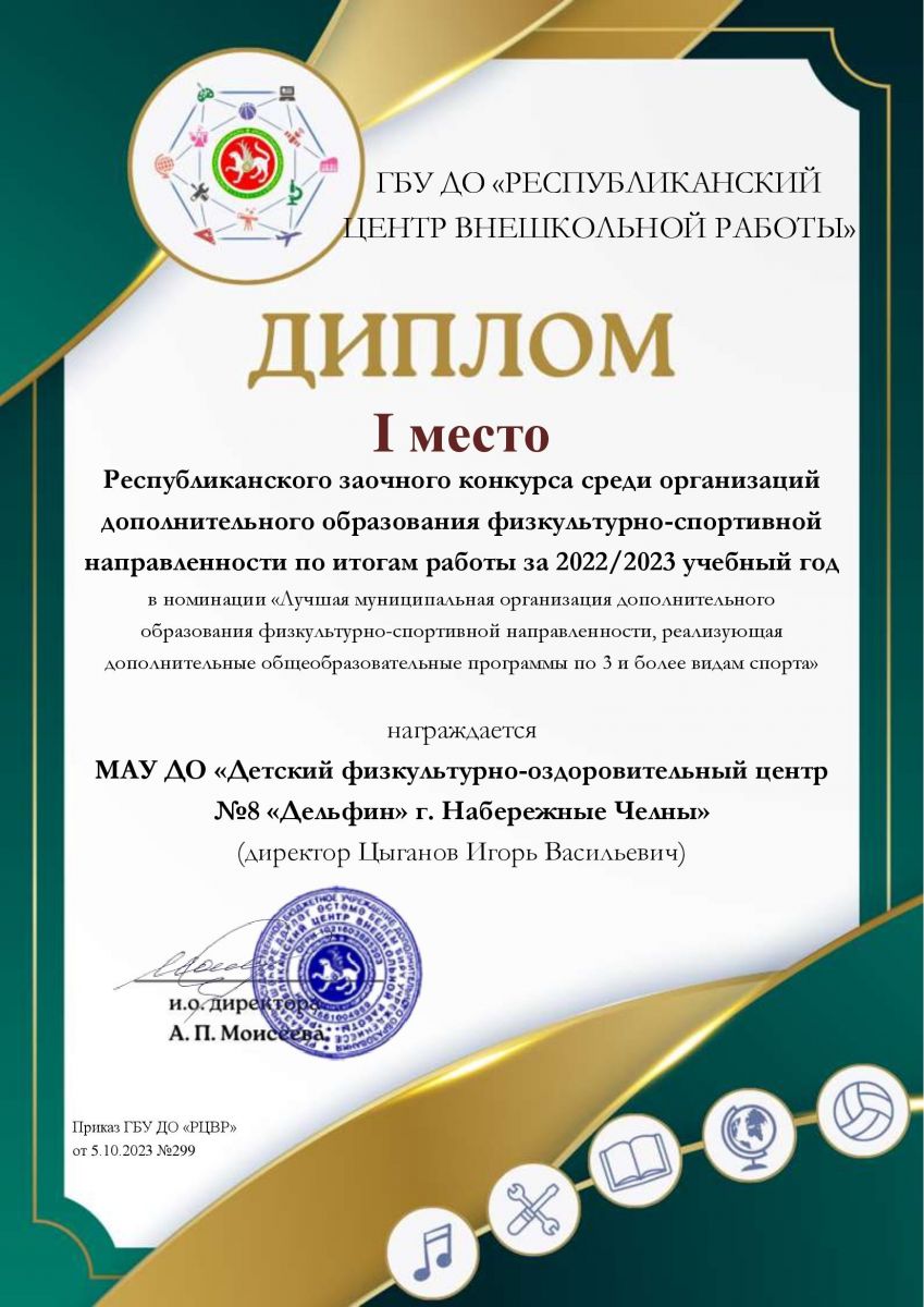 ДФОЦ "Дельфин №8" - 1 место в номинации "Лучшая муниципальная организация дополнительного образования, реализующая дополнительные общеобразовательные программы в области физической культуры и спорта" в Республике Татарстан по итогам 2022-2023 учебного года