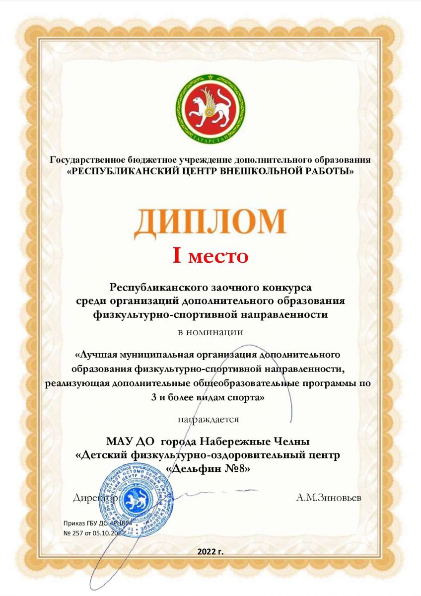 ДФОЦ "Дельфин №8" - 1 место в номинации "Лучшая муниципальная организация дополнительного образования, реализующая дополнительные общеобразовательные программы в области физической культуры и спорта" в Республике Татарстан по итогам 2021-2022 учебного года